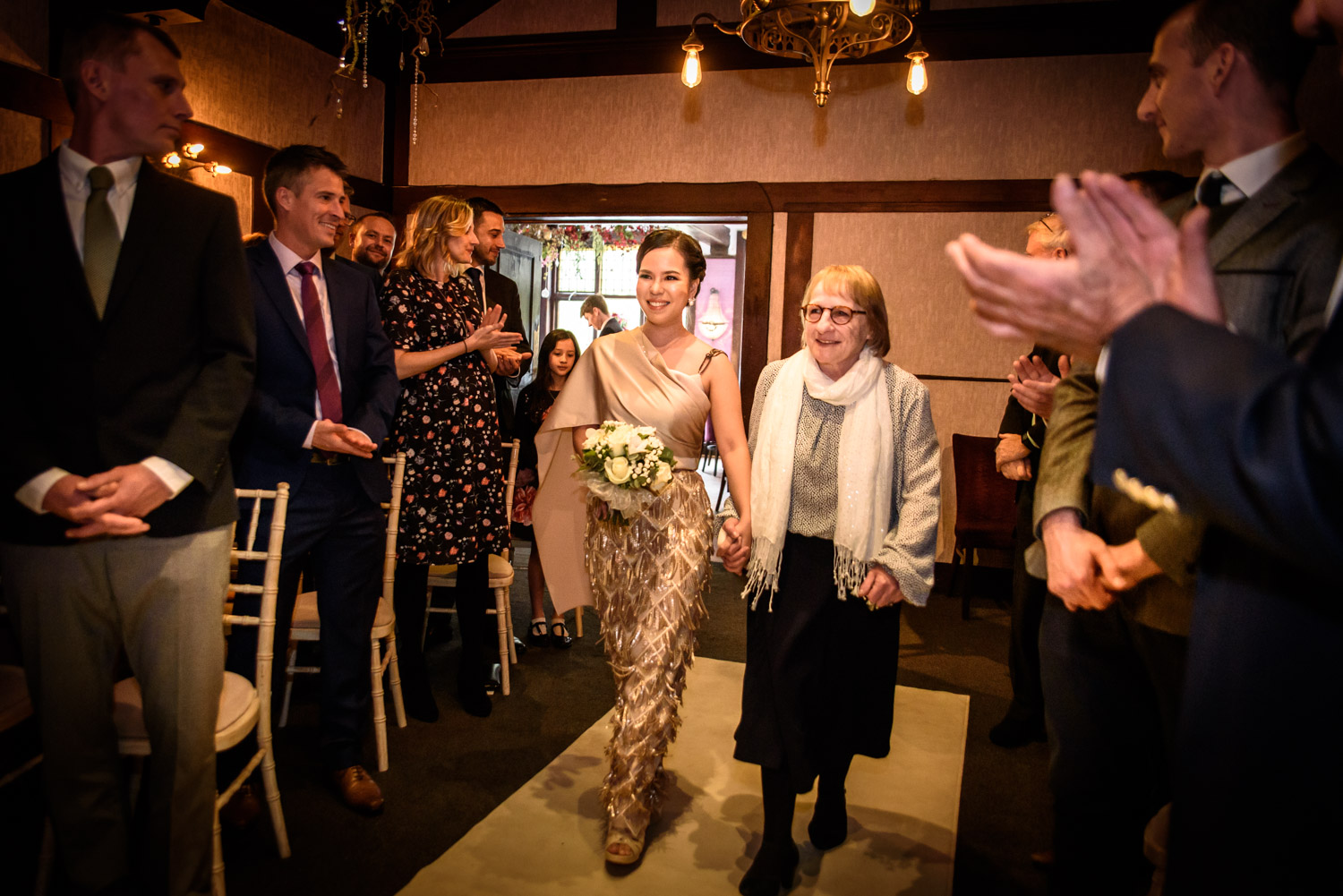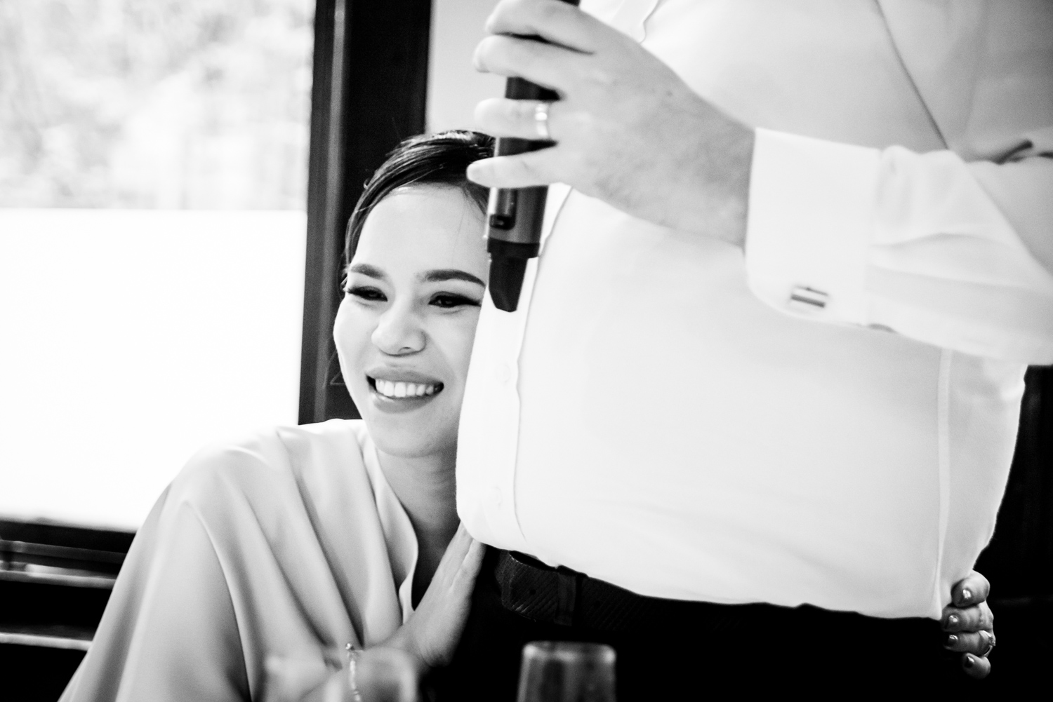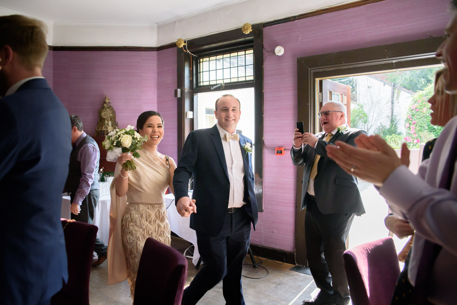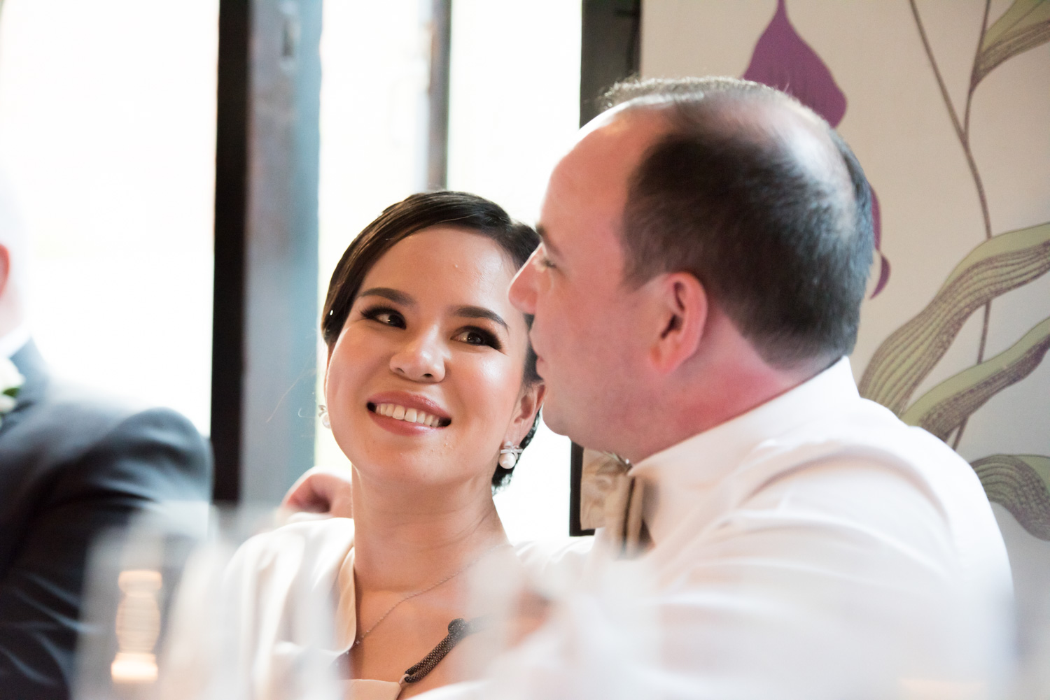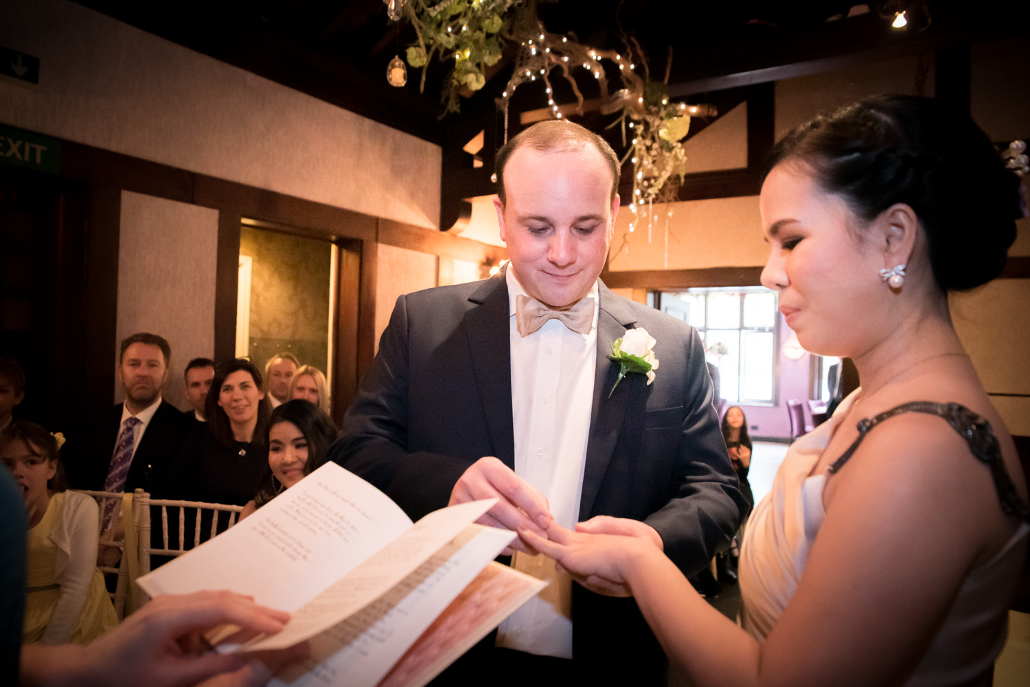 Being already legally married, Aum and Dodd chose to have Charlotte Simpson as their celebrant for a truly personalised ceremony. Charlotte told the story of Aum and Dodd’s first date and how the groom proposed several times before Aum realised he wasn’t joking! She also mentioned how the groom’s grandma Faye had had an important part in the proposal. After Faye realised that Dodd didn’t have a ring to propose with, she gave him one of her own. There was laughter across the whole room!